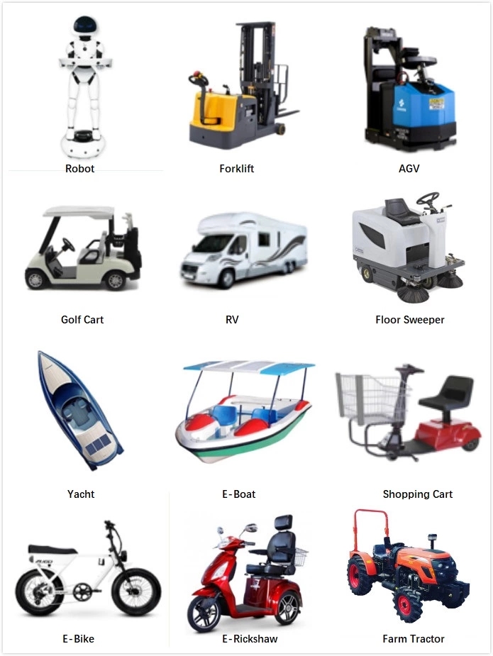 | Приложения | Гольф-кары, электрические вилочные погрузчики, тихоходные автомобили; АГВ, электрический мотоцикл; Экскурсионный автомобиль; Дом на колесах, трехколесный велосипед, электромобили, электромобили Инвалидные коляски, электроэнергетические системы, источники бесперебойного питания, системы хранения солнечной энергии, ЛОДКИ |